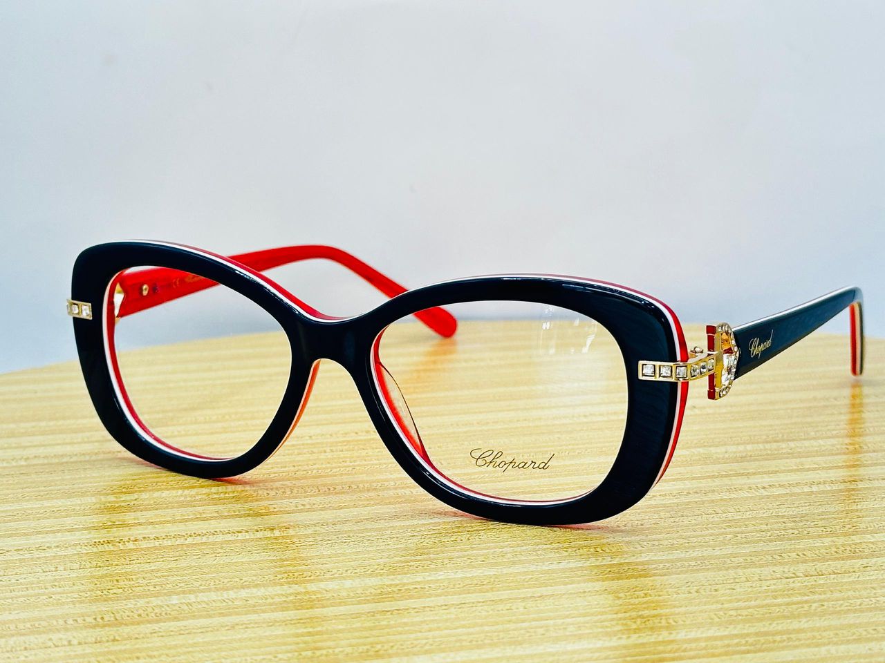 Magnifiques lunettes de vue de la marque Chopard, modèle chic avec une monture noire accentuée de rouge et d’une fine ligne blanche. Les branches sont décorées de strass dorés pour un effet luxe. Parfaites pour ajouter une touche de sophistication à votre look. État neuf, avec verres transparents prêts pour votre prescription.